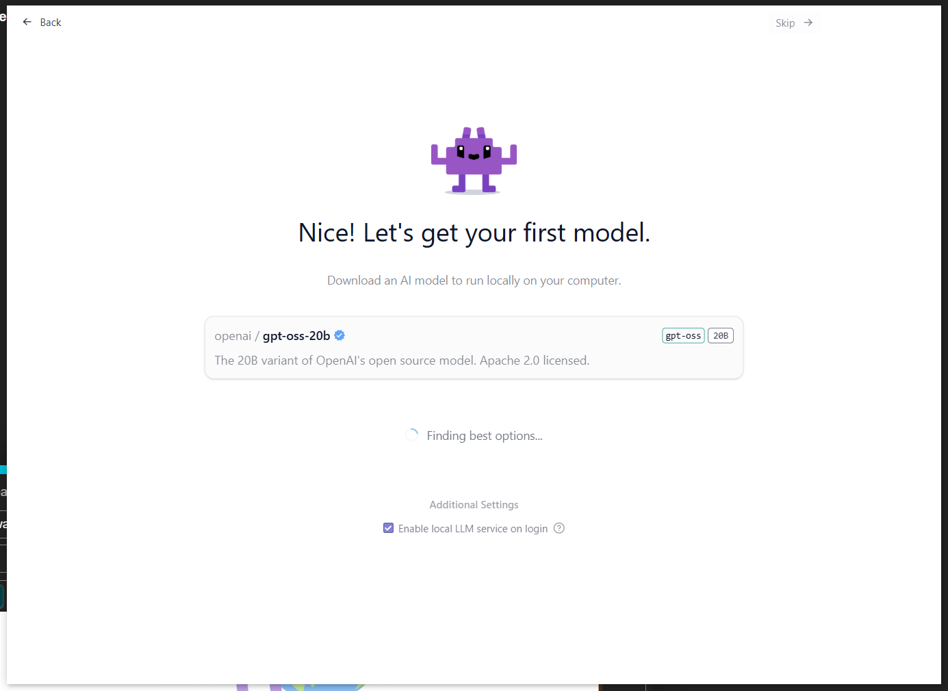 Did the “Finding best options” suggest any alternate models? I don’t remember seeing the Get Started screen when I installed but that was a while ago. Perhaps it defaults to one of the current popular models (OpenAI open weight gpt in this case) but then lists some that are appropriate for your RAM/GPU?