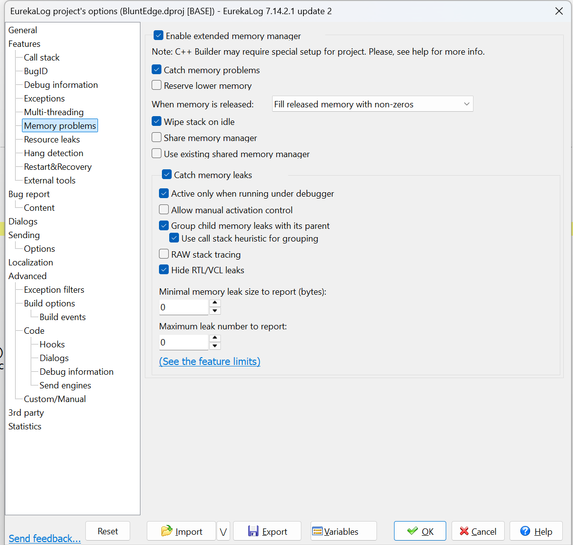 Here is a screenshot of our Memory Problems page - it allows you to configure how EurekaLog will detect and report on Heap and Stack-related bugs.